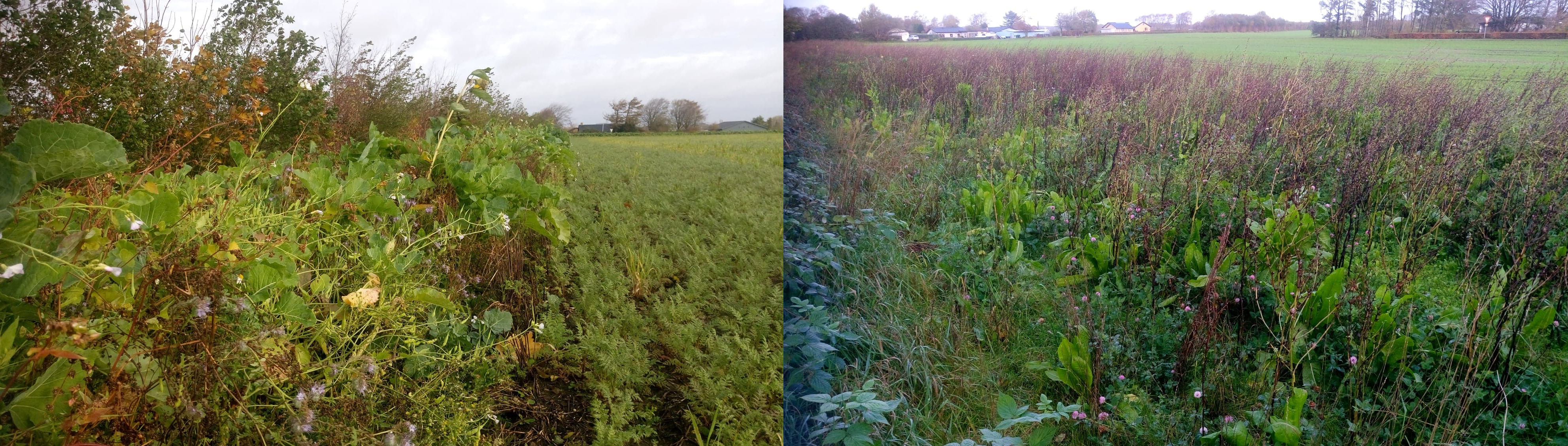 Frøblandingen består af både et og flerårige arter, så derfor skal striberne gerne blive liggende i flere år. På billederne nedenfor ses to forskellige faunastriber. Den smalle er tre meter bred og den blev sået i foråret. Den bredde er 9 meter og den blev sået sidste år. Faunastriberne ændrer sig en del, når den bliver mere end et år gammel, men det er meget tydeligt at faunastriberne er gode efterårsbiotoper også året efter det er sået. Bemærk i øvrigt hvor stor kontrast striberne er i forhold til den dyrkede mark. Der er ikke noget at sige til at vildtet bliver tiltrukket af de sået striber.